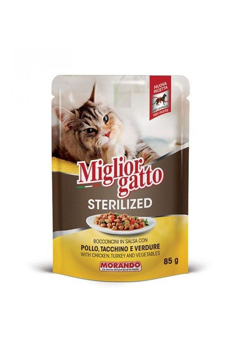 Wet food for sterilized adult cats; chicken, turkey, and vegetables; balanced nutrition; enriched with essential nutrients.