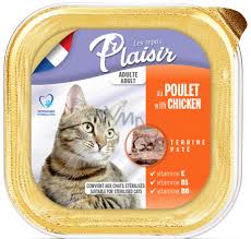 Soft terrine with chicken pieces; protein level 10%; suitable for sterilized adult cats; enriched with essential nutrients.
