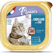 Pate with cod; formulated for sterilized cats; includes fish derivatives; enriched with vitamins and taurine; supports healthy coat and digestion.